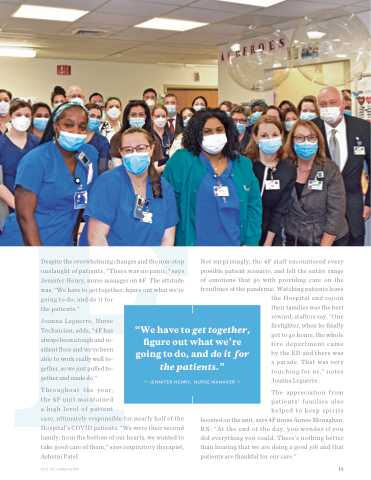 onslaught of patients, “There was no panic,” says Jennifer Henry, nurse manager on 4F. The attitude was, “We have to get together, figure out what we’re going to do, and do it for