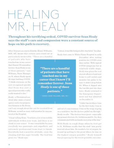 Healy first came to White Plains Hospital in early December after testing positive for COVID a few days earlier. With typical COVID symptoms but in relatively stable shape, Healy was given the oral steroid albuterol and sent home to self-isolate and monitor his pulse to be sure it didn’t drop below 90. When it dipped into the low 80s just two days later, Healy returned to the Emergency Depart- ment and was admitted